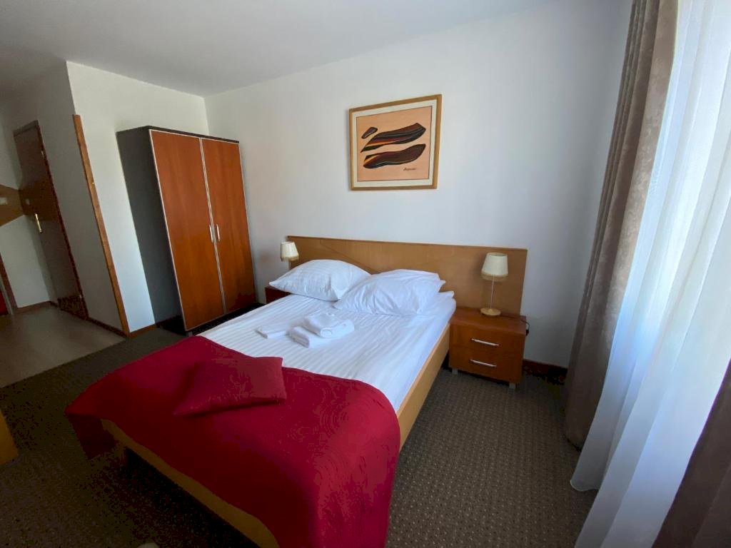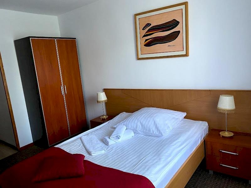 Dwa pokoje, część sypialna: duże łóżko małżeńskie; część dzienna: rozkładana kanapa, TV, zestaw do parzenia kawy/herbaty, lodówka i klimatyzacja. Osobno łazienka z wanną i toaletą.