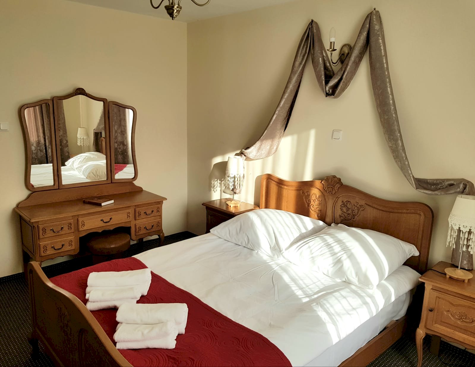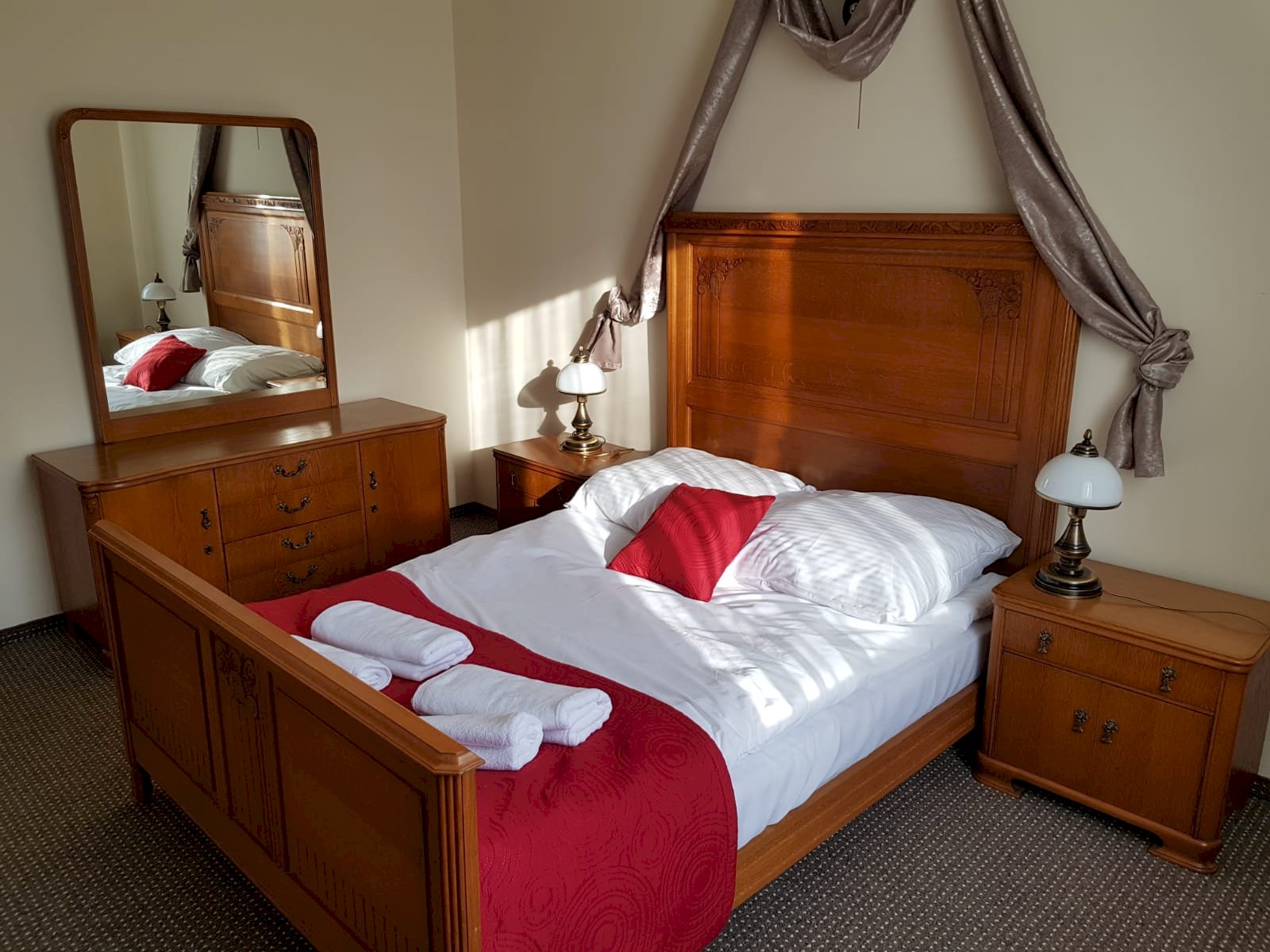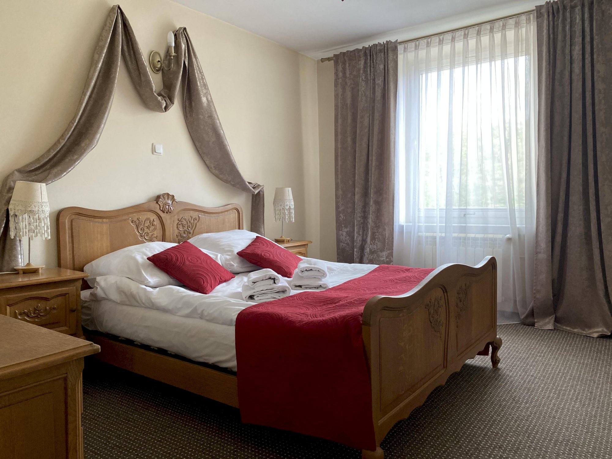 W zależności od konfiguracji: łóżko małżeńskie lub dwa oddzielne łóżka. W niektórych pokojach istnieje możliwość przygotowania dostawki.