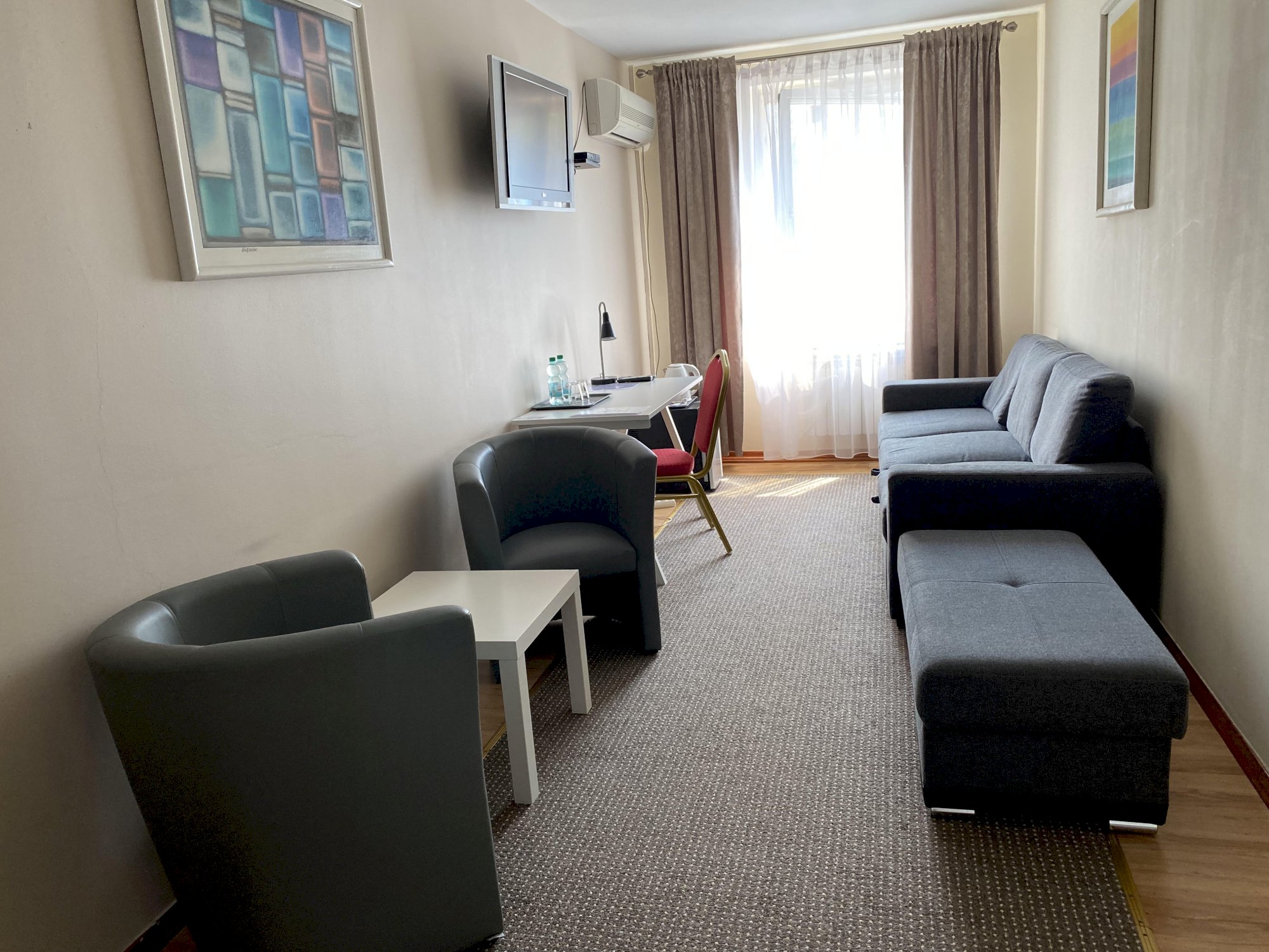Wszystkie pokoje wyposażone są w wygodne łóżka, biurka z krzesłami, szafki nocne z lampkami, szafę, TV, bezpłatne Wi-Fi oraz wodę mineralną. Każdy pokój posiada własną łazienkę z prysznicem (w pokojach Studio i Studio Plus wygodne wanny), mini kosmetyki oraz suszarki do włosów.